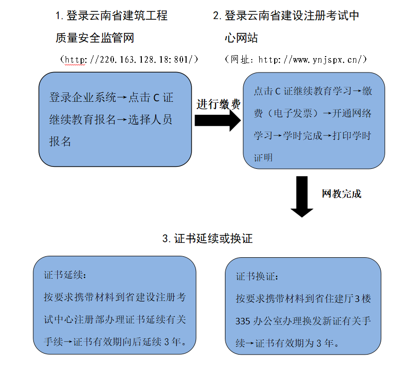 云南省建筑施工企業(yè)專職安全生產(chǎn)管理人員 (C證)繼續(xù)教育報(bào)名學(xué)習(xí)流程圖