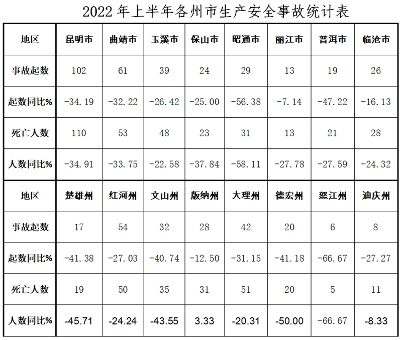 1至6月份,5個(gè)州(市)發(fā)生較大事故:大理白族自治州3起、死亡9人,同比增加2起、6人;曲靖市1起、死亡4人,同比增加1起、4人;玉溪市1起、死亡6人,同比起數(shù)持平、死亡人數(shù)增加1人;文山壯族苗族自治州1起、死亡3人,同比減少1起、4人;迪慶藏族自治州1起、死亡4人,同比增加1起、4人。各州(市)事故總體情況詳見(jiàn)下表: